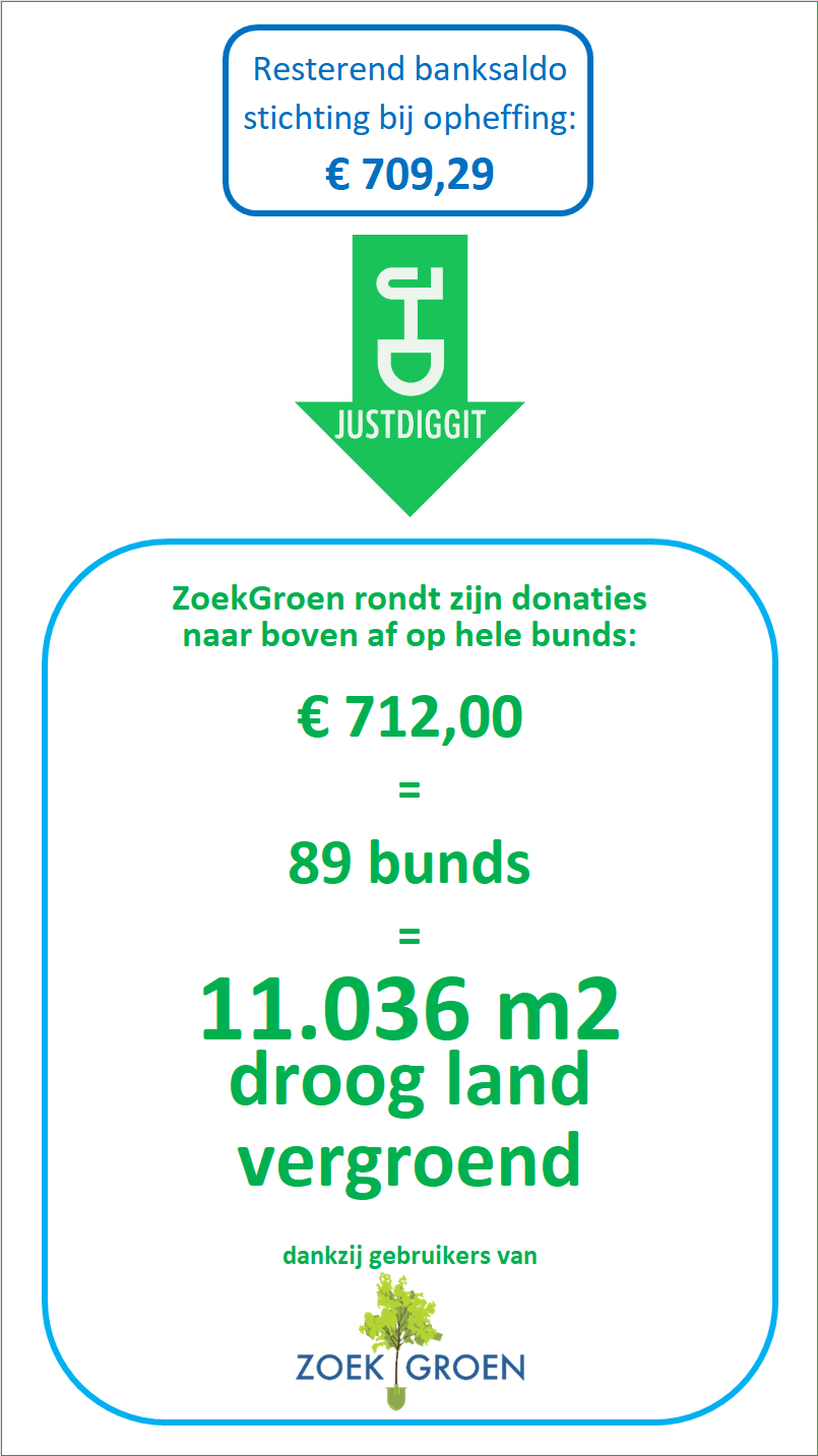 Na de beëindiging van ZoekGroen per 1 januari 2026, hebben we de afgelopen maand de laatste financiële zaken van de stichting achter ZoekGroen afgewikkeld. Het resterende banksaldo van de stichting (betrof reserveringen voor de vaste lasten voor de komende jaren) bedraagt € 709,29. Dit bedrag gaat volledig naar de vergroeningsprojecten van Justdiggit.